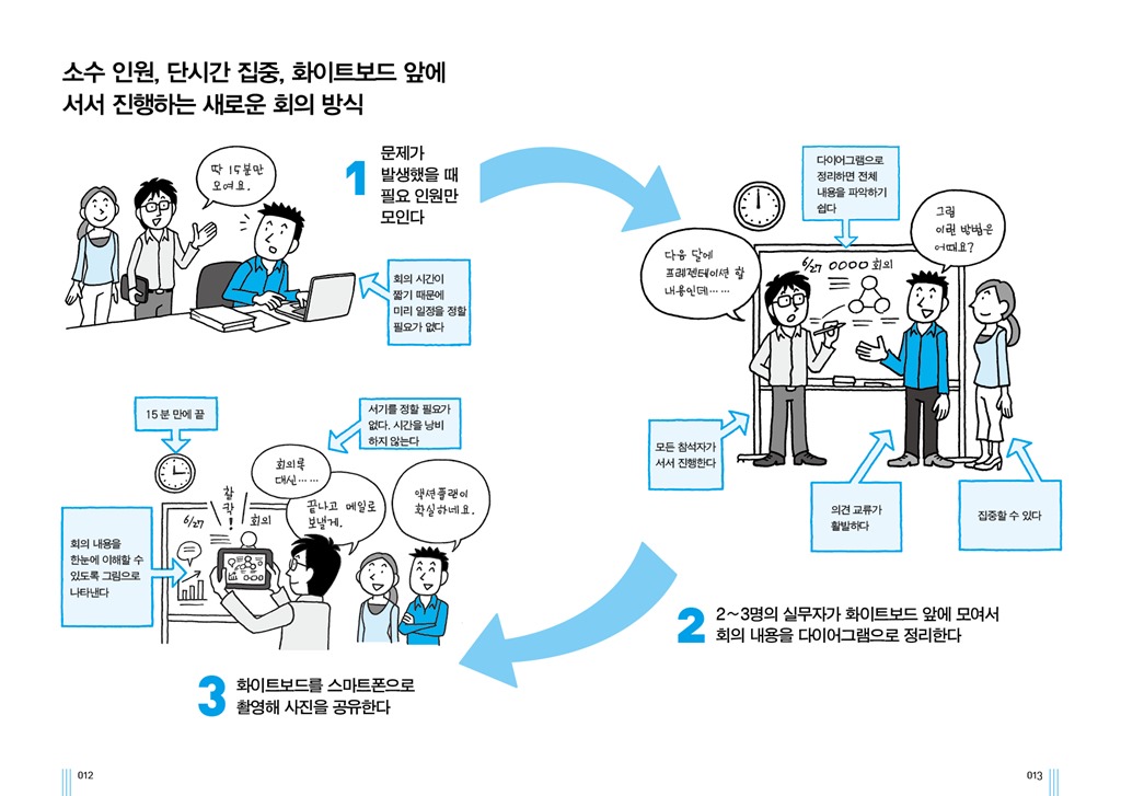 저자는 기존 회의의 대안으로 소수 인원(Small number)이 짧은 시간(Short time)에 화이트보드 앞에 서서 진행(Standing)하는 회의인 ‘3S 회의’를 권장한다. 이 회의는 문제가 발생했을 때 최소한의 필요 인원만 모인다는 특징을 갖고 있다. 또한 2~3명의 실무자가 화이트보드 앞에 모여서 회의 내용을 다이어그램으로 정리하고 그 내용을 스마트폰으로 촬영해 공유하는 식이다.