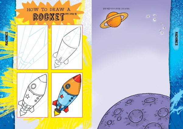 격자선 위에 그리기, 움직임과 질감 표현하기를 배워요. 남자아이들이 좋아하는 기계와 그밖에 다른 멋진 것 그리기도 단계별로 자세히 설명되어 있어요.