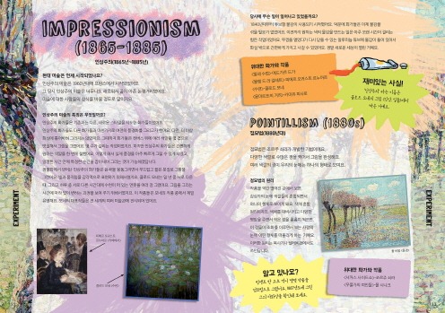 현대 미술의 역사를 살펴보는 시간이에요. 중요한 특징과 위대한 화가들을 중심으로 각 시대를 설명해요. 새로운 미술을 실험해 볼 공간도 충분해요.