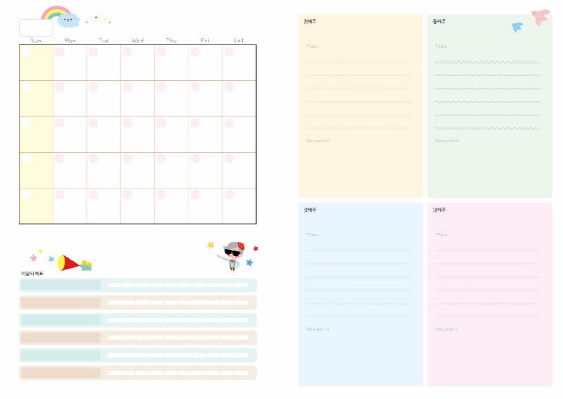이달의 목표 / 주간 계획 – 이달에 이루고 싶은 목표, 구체적인 계획, 힘이 되는 명언 등을 적고 실천해봅시다.