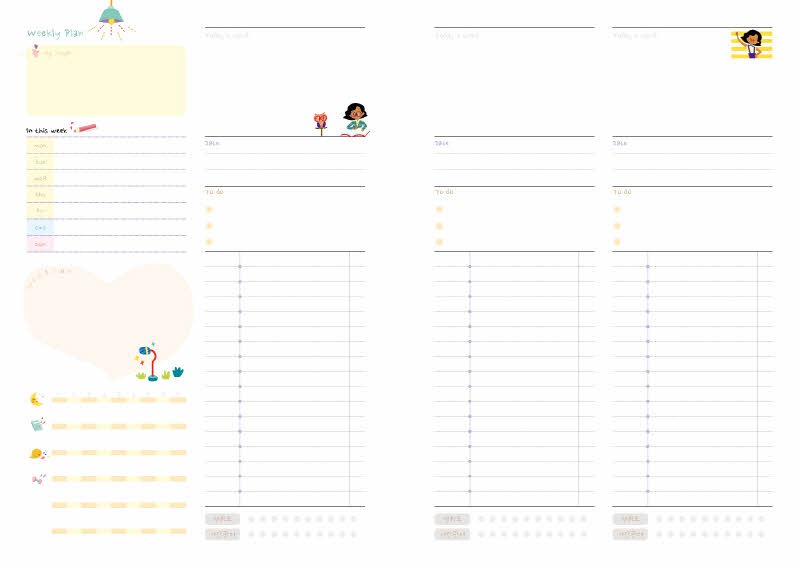 Weekly Plan×5주 – 일주일 단위로 이번 주에 해야 할 일과 학습 목표, 미션 등을 설정합니다. 그날그날 공부할 스케줄과 범위를 기록하고, 운동, 취미 등 생활을 풍요롭게 하는 여러 가지 계획들을 실천해봅시다.