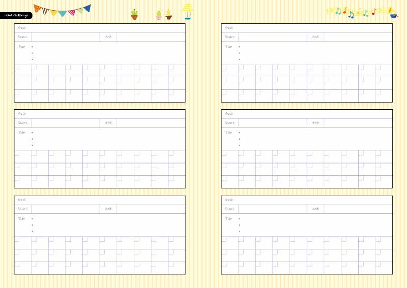 Mini Challenge – 일주일, 열흘, 한 달 등 단기간에 이루고 싶은 목표를 세우고 매일 실천 사항을 체크해보세요. 작은 목표부터 차근차근 이뤄가는 습관이 큰 목표를 이루는 데 도움이 됩니다. 쉬운 것부터 도전해봅시다!