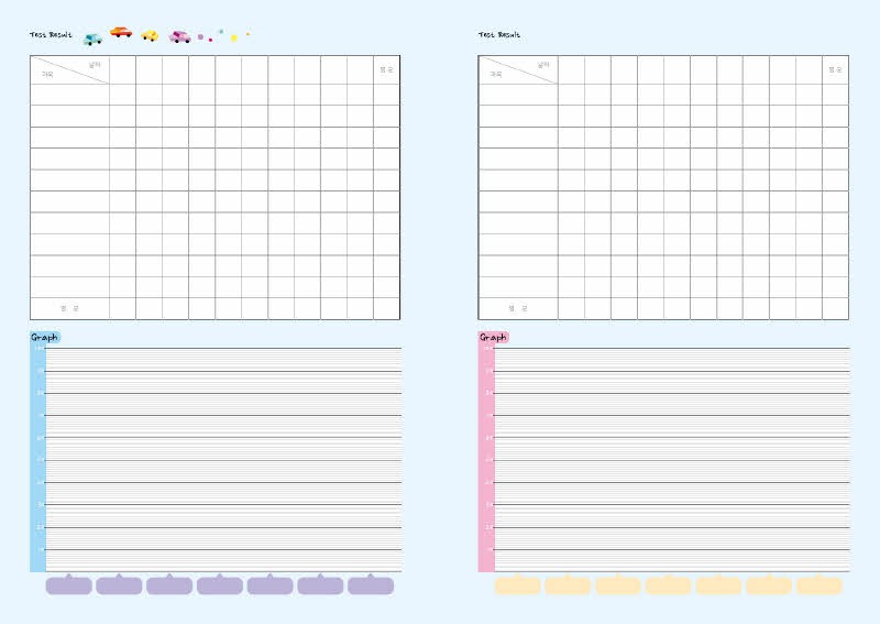 Test Result / Graph – 시험 결과를 과목별로 표 안에 정리하고 그래프로 표현해봅시다. 표와 그래프로 시각화하면 6개월 동안 과목별 성적 변화를 한눈에 알 수 있어 성적 향상에 도움이 됩니다.