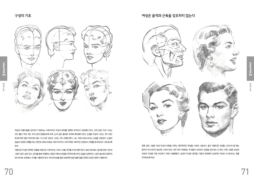 저자는 두상 묘사에 있어 중요한 포인트는 비율, 원근법, 명암 등을 올바르게 이해하고 화면에 옮기는 것이라고 역설하는 한편 두개골과 얼굴근육의 움직임에 많은 부분을 할애해 설명하고 있다.
