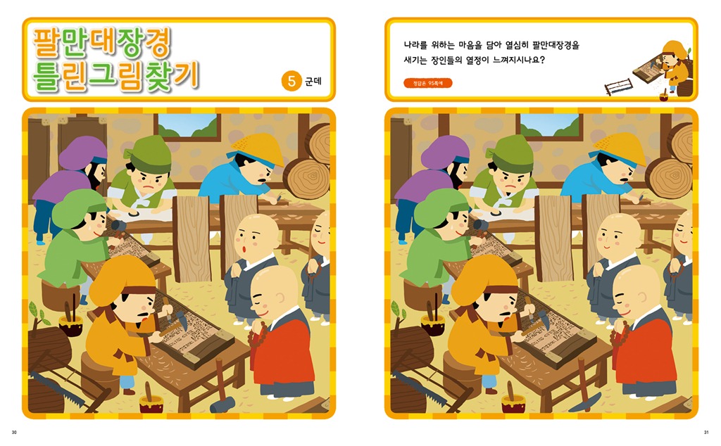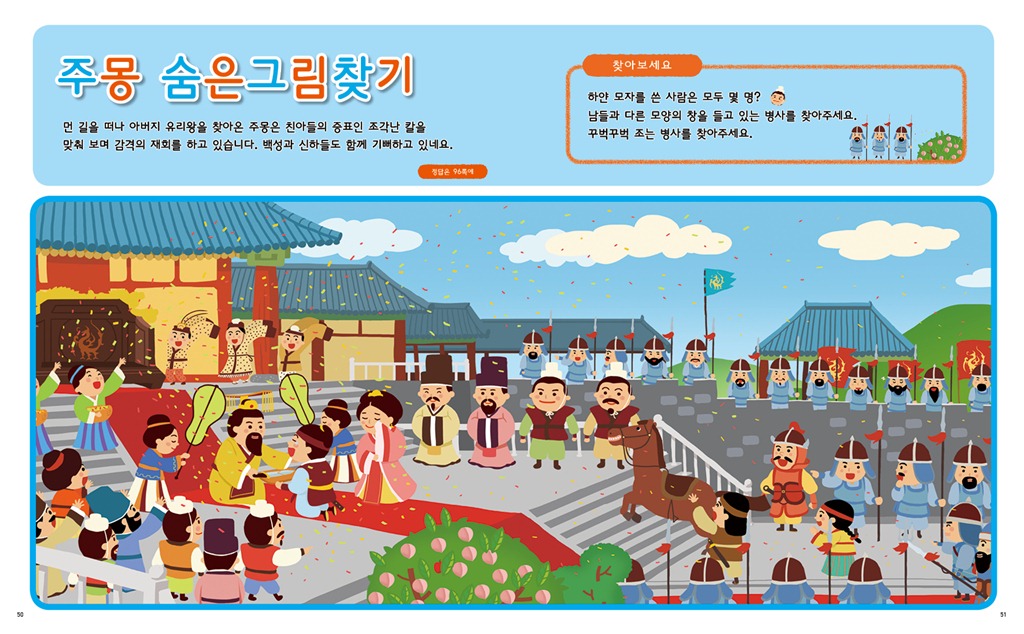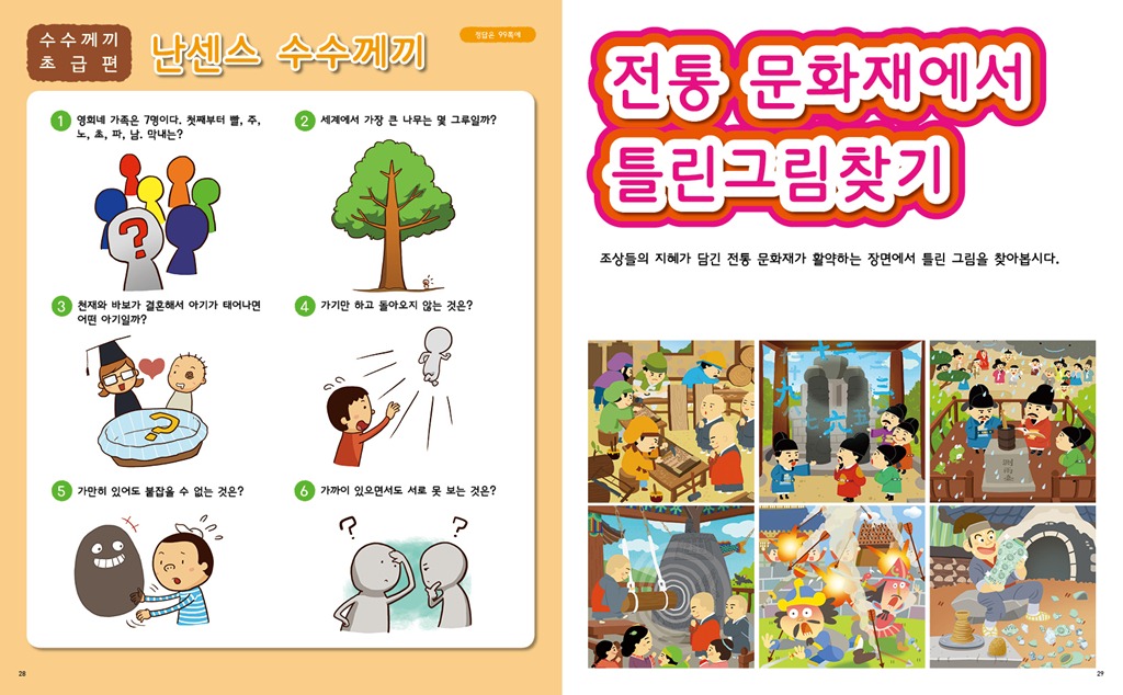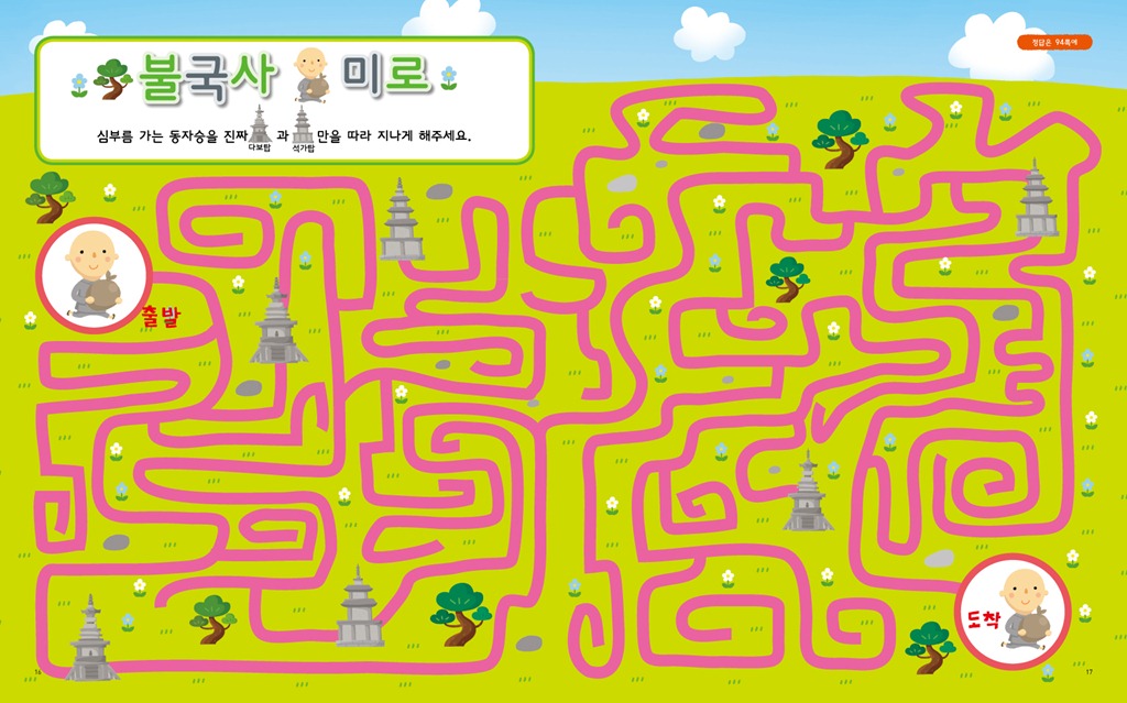 창덕궁, 석굴암, 불국사 등의 문화유적지에서 미로를 즐기고, 팔만대장경, 고려청자, 신기전을 배경으로 틀린 그림을 찾으며, 주몽, 광개토대왕, 이순신 등의 활약상을 보며 숨은 그림을 찾을 수 있다. 여기에 별주부전, 선녀와 나무꾼, 혹부리 영감 등. 전래동화의 한 장면 속으로 들어간 고난이도의 미로 퍼즐이 아이들의 승부욕을 자극한다.