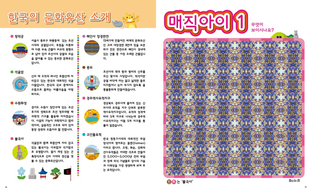 이밖에 전작에 없었던 신기한 매직아이와 한국의 전통 문화와 역사를 배울 수 있는 정보 페이지를 추가, <미로대탈출2-한국편>은 한층 발전된 책으로 거듭났다.
