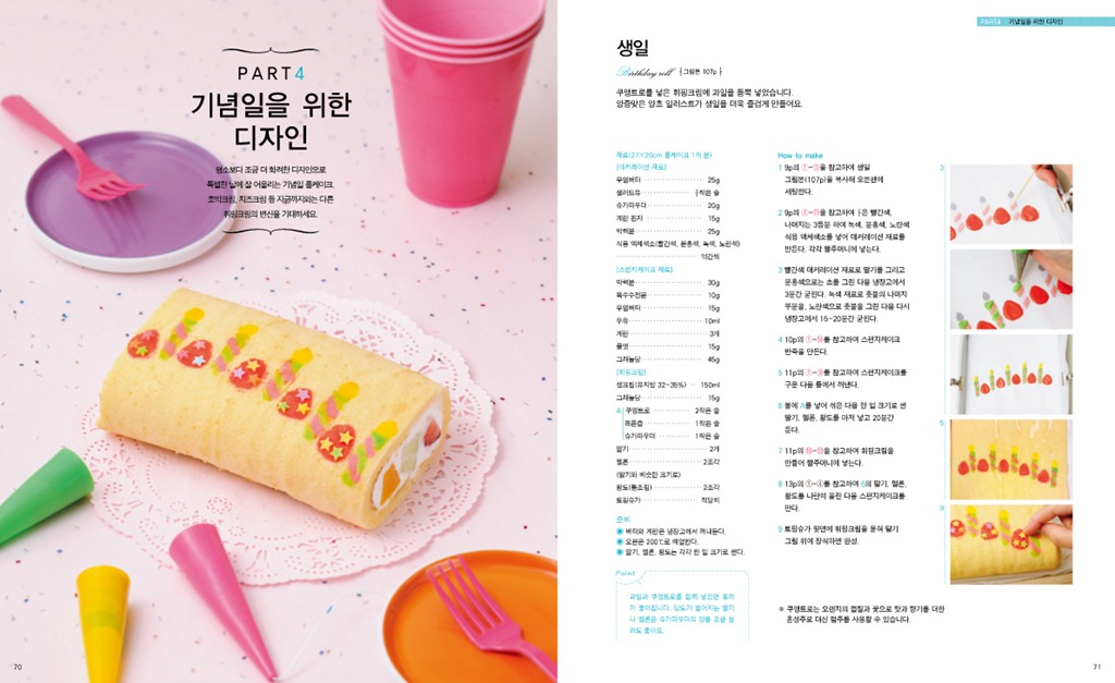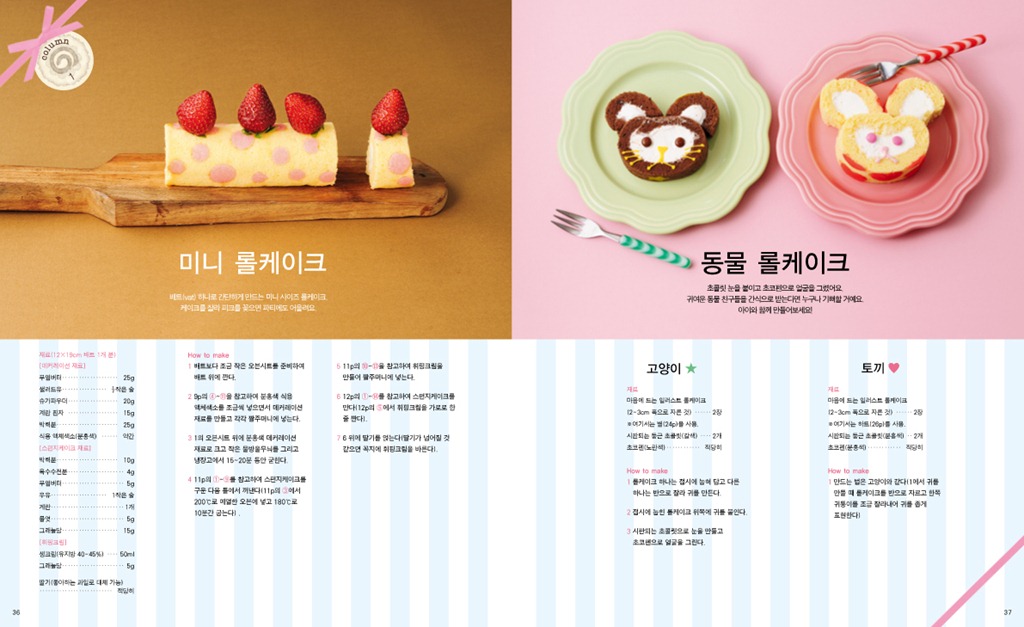 물론 홈베이킹 초보자도 쉽게 따라 만들 수 있도록 기본 재료와 도구에 대한 이야기, 아이싱, 데커레이션 재료, 스펀지케이크 만들기, 롤케이크를 예쁘게 돌돌 마는 노하우 등 기초적인 부분도 빼놓지 않고 있다.