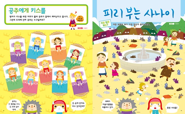 <이야기 대모험 3 그림형제 동화편>에는 그림형제의 동화 중에서 엄선한 여덟 편의 작품, ‘신데렐라’, ‘빨간 모자’, ‘브레멘 음악대’, ‘개구리왕자’, ‘잠자는 숲속의 공주’, ‘피리 부는 사나이’, ‘라푼젤’, ‘늑대와 일곱 마리 새끼 양’이 실려 있습니다. 잃어버린 보물을 찾기 위해 고양이와 고슴도치가 부엉이 아저씨를 찾아 길을 떠나면서 동화 나라에서의 모험이 시작되지요. 각 동화를 찬찬히 읽으면서 미로를 모두 해결하면 고양이의 보물을 되찾을 수 있습니다. 꼬불꼬불한 미로가 처음에는 어렵게 느껴질 수 있지만 조금만 집중하면 요령을 익힐 수 있어요. 조금씩 더 어려워지는 미로를 풀 때마다 뿌듯함도 점점 커진답니다. 미로찾기만 하면 금세 싫증이 날 것 같다고요? 걱정하지 마세요. 중간 중간에 다른 그림 찾기, 개수 세기 등 여러 퍼즐이 준비되어 있어 지루할 틈이 없어요.