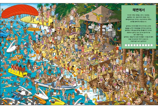 미어캣을 찾느라 집중을 했더니 눈이 너무 아프다고요? 그렇다면 고개를 조금 들어 미어캣 가족이 보내고 있는 환상적인 휴가지를 감상해 보세요. 캠프파이어 피워놓고 노래를 부르며 흥겹게 춤을 추기도 하고, 박물관에 들러 공룡화석이나 이집트 파라오의 마스크를 구경하기도 하고, 시원한 물살을 가르며 래프팅을 하기도 하죠. 그동안 여러분이 가보고 싶었던 곳, 해보고 싶었던 일을 생생한 그림을 통해 경험해 볼 수 있을 거예요. 또, 다른 나라 사람들이 어떻게 생활하는지, 우리나라와 비교하면 어떤 점이 비슷하고 어떤 점이 다른지 생각해 볼 수도 있답니다.