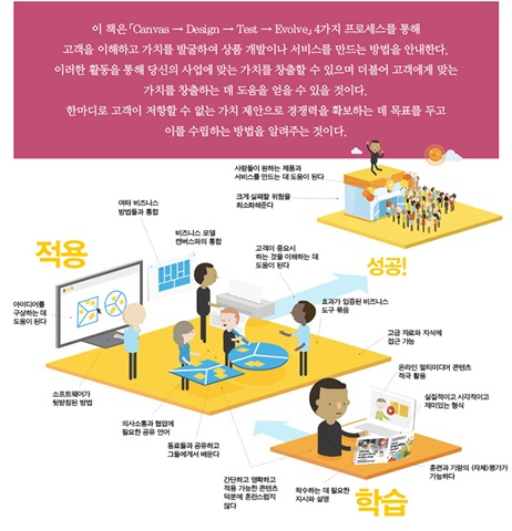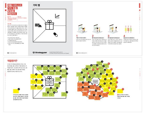 한편으로 이 책은 제시된 이론을 비즈니스 현장에 바로 적용할 수 있는 실제 훈련에 좀 더 무게를 두고 있다. 때문에 그림 및 도구를 이용해 새로운 제품과 서비스, 아이디어를 개선하는 데 도움을 주고자 한다. 이 책에서 독점 제공하는 자료들은 스트래타이저닷컴(strategyzer.com)에 가입하면 각종 PDF와 체크리스트 등을 다운로드 할 수 있다(스트래타이저닷컴은 향후 한국어를 포함한 다국어를 지원 예정이다).