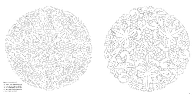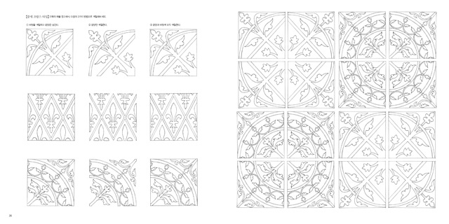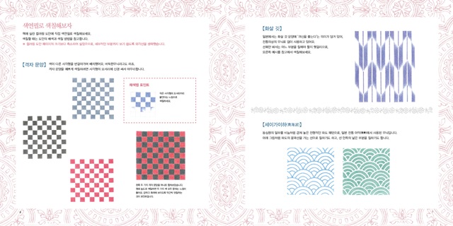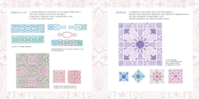 이탈리아의 장식용 타일과 루마니아 자수에 담긴 문양을 볼 수 있으며 중근동 지방 특유의 패턴도 맛볼 수 있죠. 네덜란드, 스웨덴의 전통 패턴과 러시아의 레이스, 멕시코, 포르투갈의 자수에 그려진 문양을 살펴보고 색칠할 수 있습니다. 동양미를 물씬 풍기는 중국의 길상 문양과 일본의 벚꽃, 국화 문양도 놓치지 말아야 할 포인트입니다.