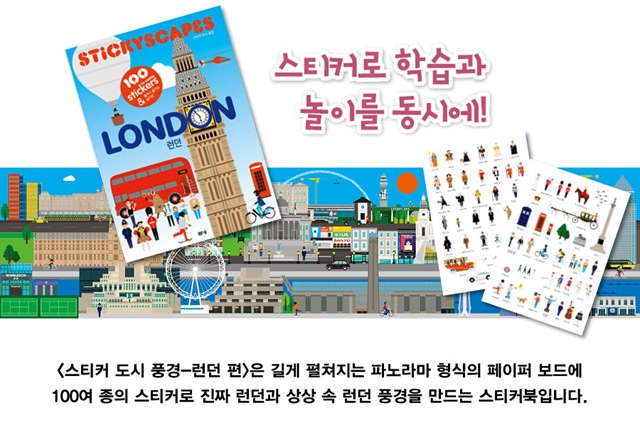 <스티커 도시 풍경-런던 편>은 길게 펼쳐지는 파노라마 형식의 페이퍼 보드에 100여 종의 스티커로 진짜 런던과 상상 속 런던 풍경을 만드는 스티커북입니다. 영국 런던의 유명한 건축물은 무엇이고 어디에 있는지 또 유명 인사는 누구이고 어떤 사람인지 알 수 있죠.