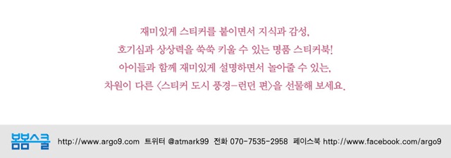 재미있게 스티커를 붙이면서 지식과 감성, 호기심과 상상력을 쑥쑥 키울 수 있는 명품 스티커북! 아이들과 함께 재미있게 설명하면서 놀아줄 수 있는, 차원이 다른 <스티커 도시 풍경-런던 편>을 선물해 보세요.