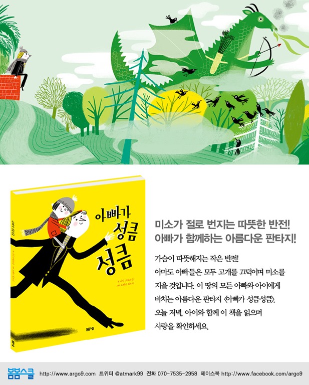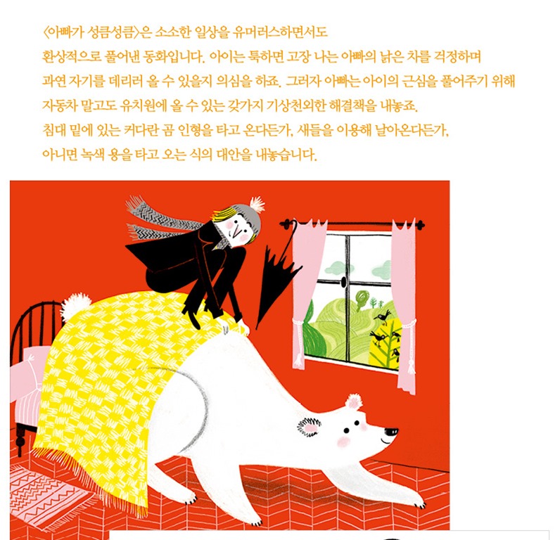 <아빠가 성큼성큼>은 소소한 일상을 유머러스하면서도 환상적으로 풀어낸 동화입니다. 아이는 툭하면 고장 나는 아빠의 낡은 차를 걱정하며 과연 자기를 데리러 올 수 있을지 의심을 하죠. 그러자 아빠는 아이의 근심을 풀어주기 위해 자동차 말고도 유치원에 올 수 있는 갖가지 기상천외한 해결책을 내놓죠. 침대 밑에 있는 커다란 곰 인형을 타고 온다든가, 새들을 이용해 날아온다든가, 아니면 녹색 용을 타고 오는 식의 대안을 내놓습니다.