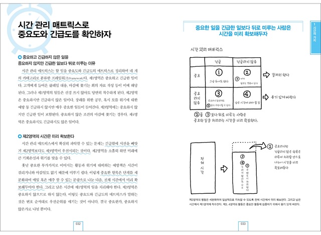 강의를 듣듯 순서대로 본문을 읽다보면 시간의 가치와 효율에 대해 다시 생각하는 것은 물론 당장 적용 가능한 기술들을 발견할 수 있을 것이다. 또한 책의 말미에는 테스트가 수록되어 있어 독자들이 직접 자신의 현 시간 관리 달성도를 자가 체크 할 수 있다.