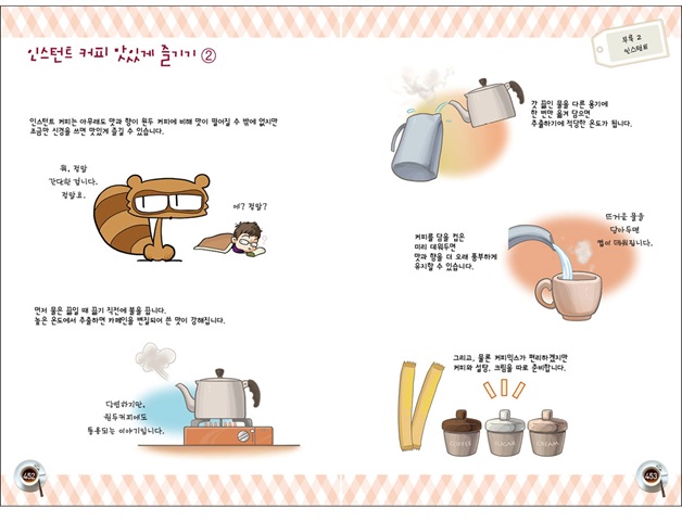 인스턴트 커피를 말하다/인스턴트 커피는 어떻게 만들어질까?/인스턴트 커피의 품종/프림? 프리마?/커피 크림!/ 인스턴트 커피 맛있게 즐기기①/인스턴트 커피 맛있게 즐기기②/인스턴트 커피 – 폴리페놀이란?/인스턴트 커피에 대한 오해들
