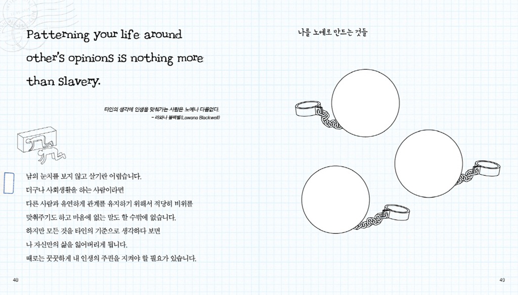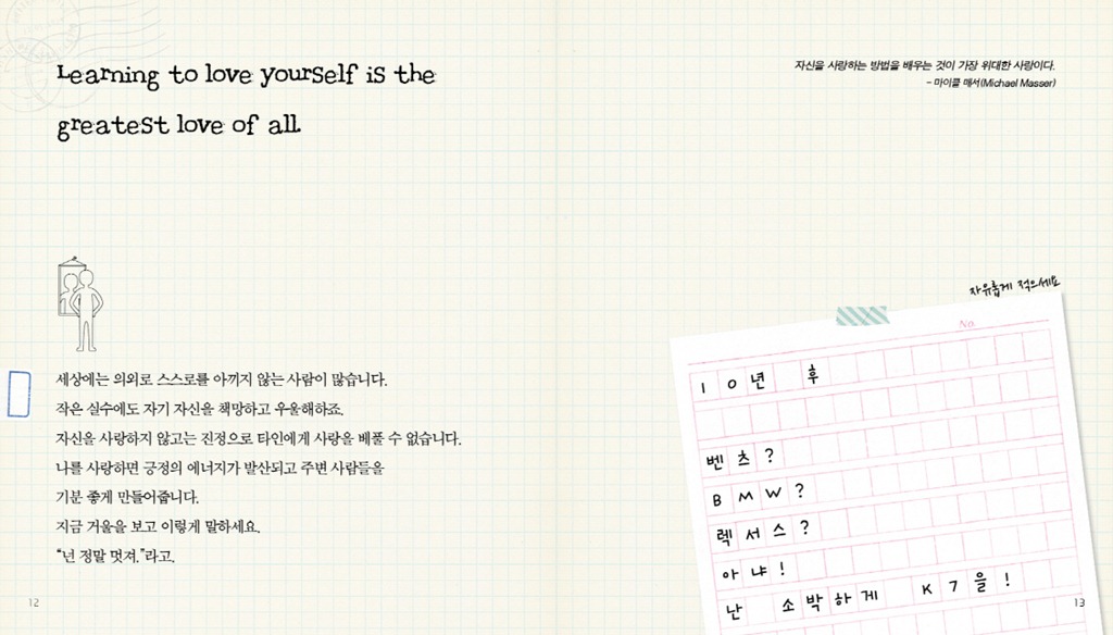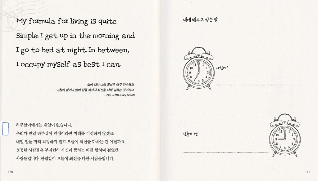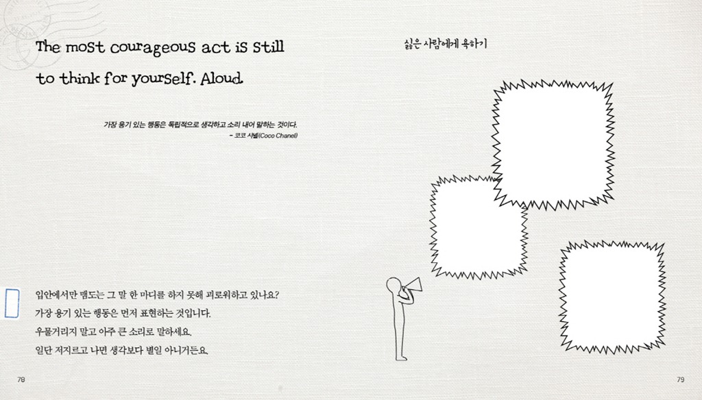 하지만 이 책은 여기에서 끝나지 않습니다. <셀프 힐링북>에는 독자가 직접 표기할 수 있는 공간이 곳곳에 배치되어 있습니다. 자신만의 명언을 넣을 수도, 꿈과 행복의 메시지를 펜으로 적어 책을 완성할 수 있게 만들어졌습니다.