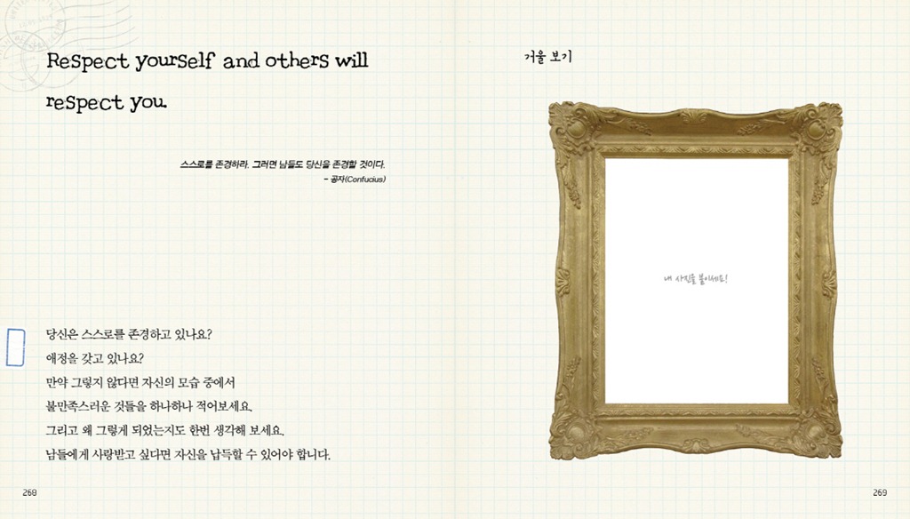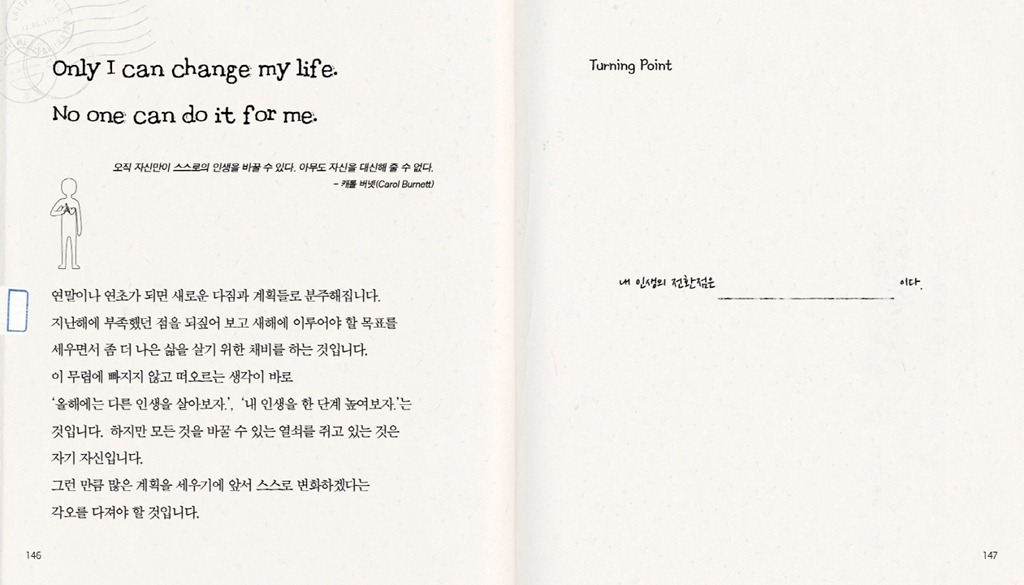 희망의 씨앗 / 만족의 구름 / 원인과 결과 / 나를 슬프게 하는 것들 / 일 년간 읽은 책들 / My Dreams / 후회 / 좋아하는 사람 / 선택의 재미 / Turning Point / 이루고 싶은 소망 하나 / 도전의 역사 / To. 엄마 / 내게 해주고 싶은 말 / 내 앞에 있는 것은? / Before & After