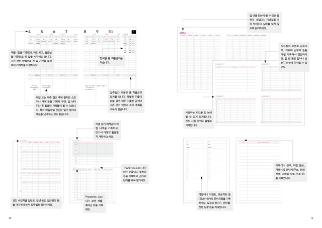 <2016 스마트 가계부>는 요즘 생활 패턴에 딱 맞게 고안하고 디자인한 가계부입니다. 쓰기 편한 구성은 기본, 매일 한 장씩 펜으로 입출금을 기록하고 정리하다 보면 돈의 흐름을 한 번에 알 수 있도록 배열했습니다. 소비 패턴을 파악하고 돈이 어디로 빠져나가는지를 체크하는 것은 물론이거니와 주부에게는 꼭 필요한 핵심 정보도 빠짐없이 담았습니다.