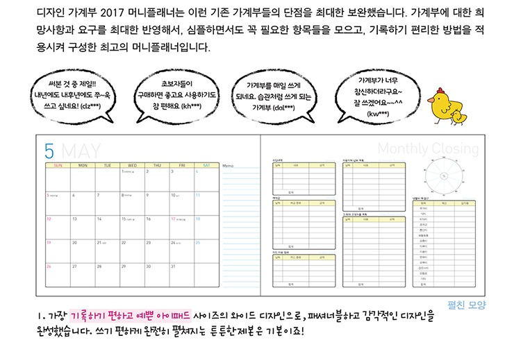 2017 가계부 머니플래너는 기존 가계부들의 단점을 최대한 보완했습니다. 가계부에 대한 희망사항과 요구를 최대한 반영해서, 심플하면서도 꼭 필요한 항목들을 모으고, 기록하기 편리한 방법을 적용시켜 구성한 최고의 머니플래너입니다. 2012년 첫 출시 이래 5년 연속 가계부 돌풍을 일으킨 베스트셀러이기도 합니다. 그럼, 어떤 특징이 있는지 살펴볼까요?