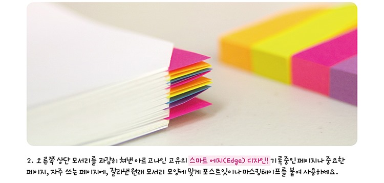 2. 오른쪽 상단 모서리를 과감히 쳐낸 머니플래너 고유의 스마트 에지(Edge) 디자인! 기록중인 페이지나 중요한 페이지, 자주 쓰는 페이지에, 잘라낸 원래 모서리 모양에 맞게 포스트잇이나 마스킹테이프를 붙여 사용하세요.