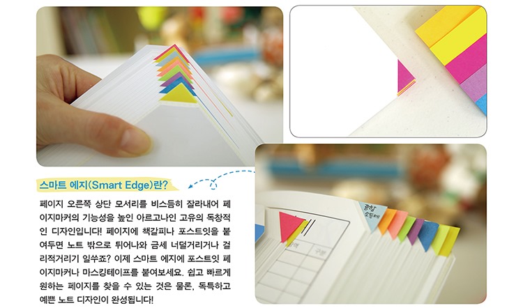 페이지 오른쪽 상단 모서리를 비스듬히 잘라내어 페이지마커의 기능성을 높인 아르고나인만의 독창적인 디자인입니다! 기록 중인 페이지나 중요한 페이지, 자주 쓰는 페이지에 책갈피나 포스트잇을 붙여두면 노트 밖으로 튀어나와 금세 너덜거리거나 걸리적거리기 일쑤죠? 이제 스마트 에지에 포스트잇 페이지마커나 마스킹테이프를 붙여보세요. 쉽고 빠르게 원하는 페이지를 찾을 수 있는 것은 물론, 독특하고 예쁜 노트 디자인이 완성됩니다!