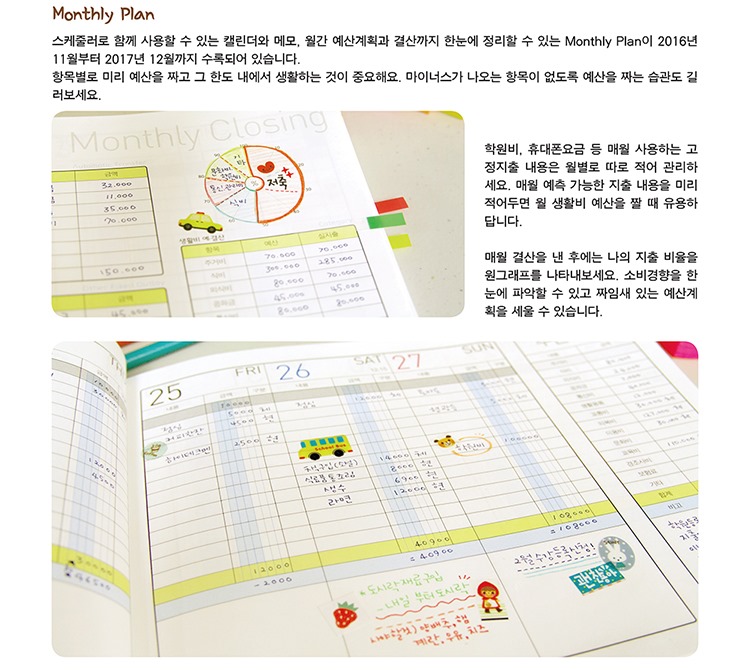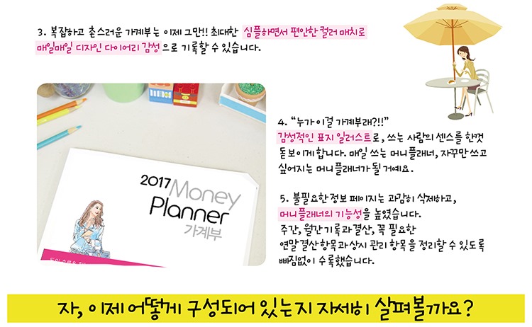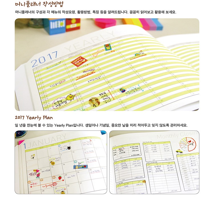 2017 가계부 머니플래너는 그냥 단순한 가계부가 아닙니다. 일상의 기록을 통해 날마다 업그레이드되는 라이프스타일을 만들어가는 스마트한 라이프 플래너입니다.