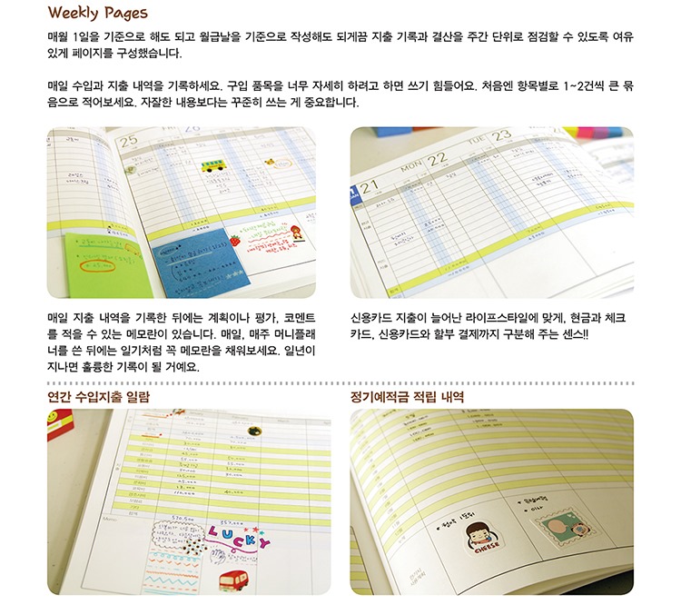 그런데 혹시 작년에도 재작년에도 가계부를 샀었지만 책상 한구석에 아니면 어디 처박혀 있는지도 모르는 건 아닌가요? 마음먹은 대로 꾸준히 잘 쓰지 못하는 가계부 습관 때문에 그냥 “내가 너무 게으른가보다, 내가 의지력이 약해서 그렇지 뭐….”하며 자책하는 건 아닌가요? 흔히 접하는 가계부들은 너무 복잡하거나 쓰기 불편해서 꾸준히 가계부를 쓰는 습관을 기르기 힘들었을 거예요. 내 생활 패턴에 딱 맞고 쓰기 간편한 가계부만 있다면 누구나 돈 모으는 습관, 가계부를 꾸준히 쓸 수 있겠죠. 그 때문에 머니플래너가 탄생하게 된 거랍니다.