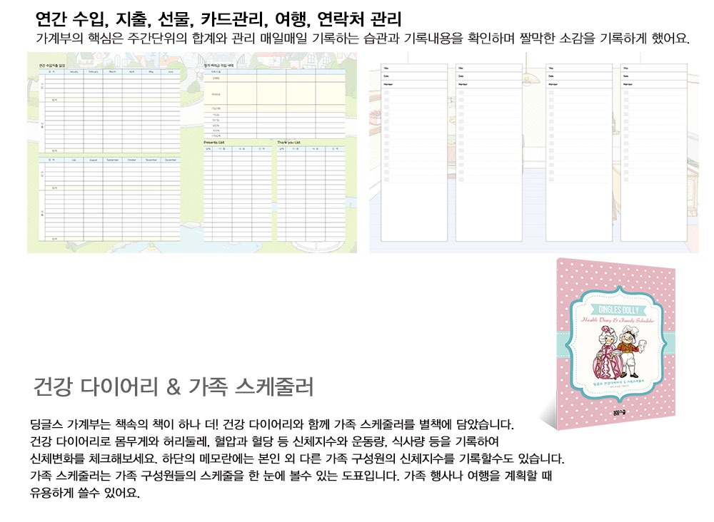 책 부록 다이어리 가족의 건강을 관리할 수 있는 체중, 혈당, 식단관리는 물론 아이의 성장 과정도 기록할 수 있어 기존 가계부에 부족한 부분을 제공해요. 또한 가족의 스케줄을 관리할 수 있는 다이어리도 있어 1년간 가족의 행사나 여행계획, 공연, 문화생활, 휴가계획, 방학, 경조사 등을 한눈에 볼 수 있게 기록할 수 있게 구성했어요.