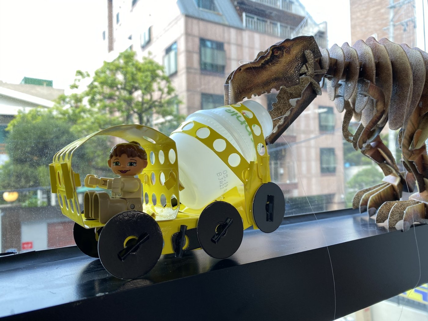 레미콘을 몰고가는데 뒤에 이상한 공룡이 우유달라고 우유주면 안잡아먹는다고 해요… 액셀레이터를 밟아 도망가려는데 공룡이 단지를 물었어요
