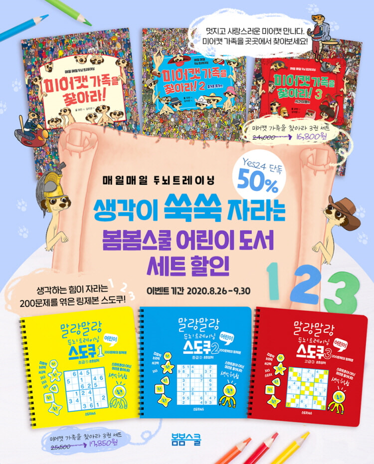 미어캣 가족을 찾아라와 말랑말랑 두뇌트레이닝 스도쿠 1,2,3 집에서 집중하기 힘들 때 잠깐씩 풀어보고 몰입의 즐거움을 느낄 수 있는 숨은그림 찾기와 스도쿠를 즐겨보세요 게다가 단독 50% 할인
