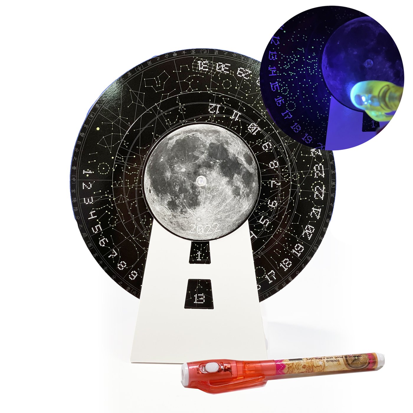 우주의 시간처럼 일, 월 두개의 회전하는 휠을 사용하는 만년력에는 특별한 비밀이 있습니다. 모든 별을 형광물질로 제작하여 함께 동봉한 비밀 펜(블랙 라이트 UV-A)을 비추면 어둠 속에서 별자리가 선명하게 나타납니다.