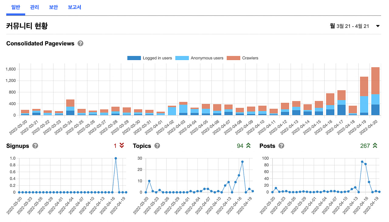 지속적으로 성장하고 있으나 아직 1% 정도 밖에 콘텐츠를 넣지 않았습니다. 네이버, 워드프레스, 인스타그램, 틱톡, 유튜브, 페이스북페이지, 페이스북 그룹 등 다양하게 퍼트려놓은 글들을 백업받은 것을 Discourse 커뮤니티에 자동으로 등록하는 프로그램을 만들고 있습니다.