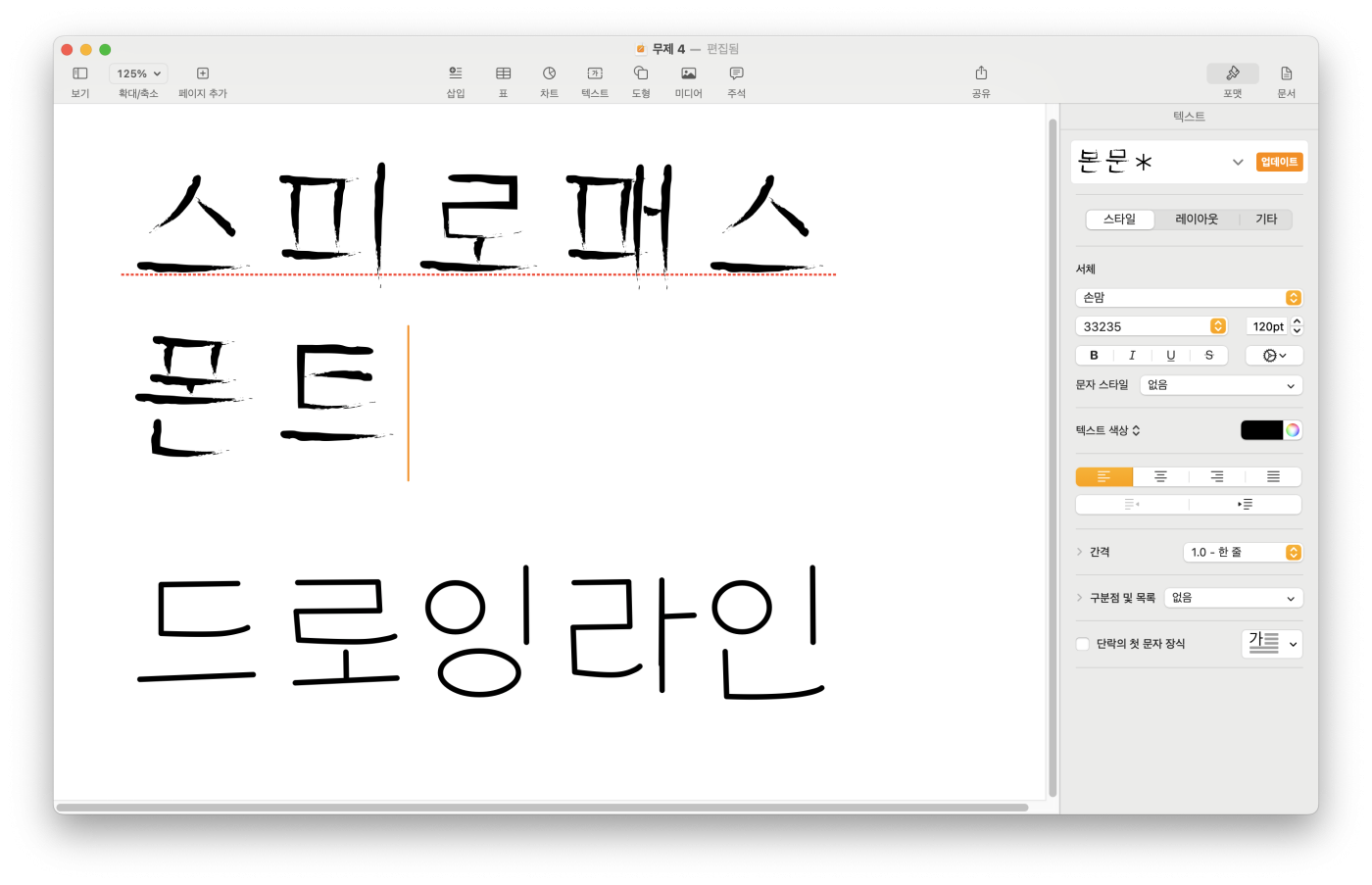 캘리그래피 용도의 Spiro Path 를 기반으로 제작한 한글폰트를 일단 테스트 했습니다. 잉크스케이프의 기능이나 현재 패스를 일러스트레이터의 브러시스타일을 지정하면 그 스타일로 다양한 폰트가 생성될 수 있고 필기구의 느낌을 폰트에 지정할 수 있어서 다양한 펜, 붓, 연필 필기구에 대한 압력 효과를 적용할 수 있습니다.