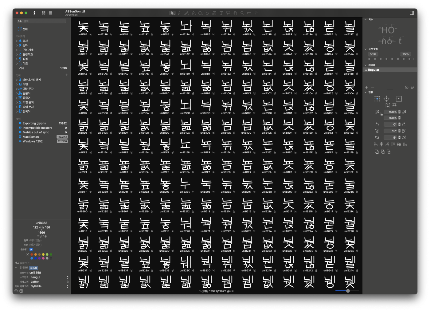 이제 남은 것은 영문이나 약물이 될 것이고 일본 타이포그래피를 하는 분하고 잠깐 이야기 나눴는데 일본어에 가장 문제가 되는 부분이 한자인데 이 방식을 사용하면 부수별로 한자를 대량으로 생성할 수 있으리라 생각됩니다. 이제 한글폰트를 만드는 것 뿐 아니라 원래 목표하던 전세계 언어를 다 쓰고 적용하는 것이 가능해 보입니다.