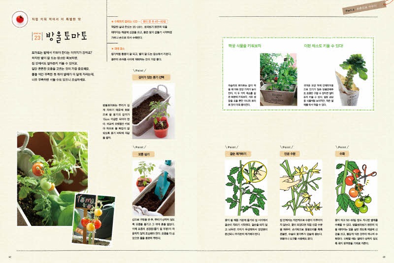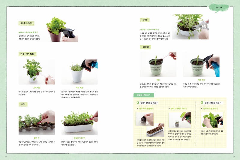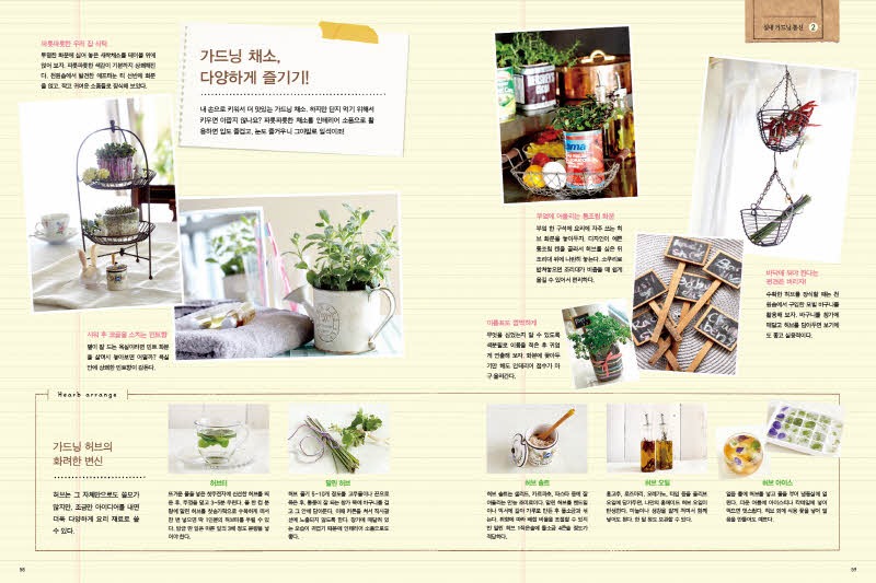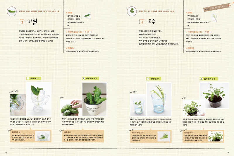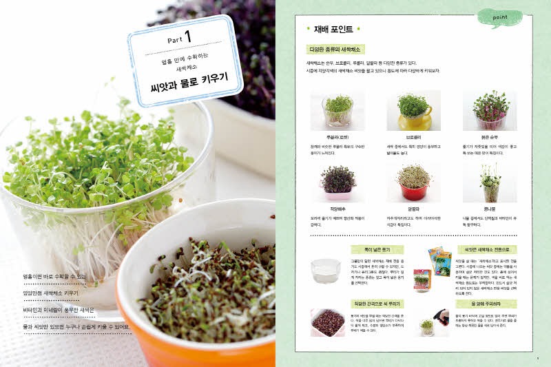 실내 가드닝 새싹채소로 꾸미는 집 안의 작은 텃밭\n\n실내가드닝입체표지\n\n제 목: 실내 가드닝(새싹채소로 꾸미는 집 안의 작은 텃밭)\n\n저 자: 스즈키 아사미\n\n역 자 : 김세원\n\n펴낸 곳: 아르고나인\n\n판 형: 180×240\n\n면 수 : 80\n\n발행일 : 2013년 4월 20일\n\n입고일 : 2013년 4월 2일 입고 예정\n\n정 가 : 12,800원\n\nI S B N : 978-89-97227-89-1 13520\n\n———————————————————————–\n\n1. 책 소개\n\n몸에 좋은 웰빙 새싹채소를 집안에서 손쉽게 기르는 실내 가드닝\n\n초보라도 부담 없이 시작하고 빠르게 수확할 수 있어요!\n\n요즘엔 집안에서 비교적 작은 채소나 허브, 새싹채소 등을 직접 길러 먹는 실내 가드닝이 인기죠. 꼭 먹기 위해서가 아니라도 관상용으로 취미생활로 가드닝이 폭넓게 자리 잡았어요. 하지만 아파트 같은 공동주택에 살다보면 작은 채소라도 심을 장소가 마땅치 않아 포기하는 분들이 많죠. 걱정할 필요는 없어요. <새싹채소로 꾸미는 집 안의 작은 텃밭-실내 가드닝>은 좁은 실내에서도 부담 없이 키울 수 있는 채소와 허브, 새싹채소에 대한 모든 것을 알려드릴 거예요. 기본 준비물도 아주 간단해요. 어느 집에나 굴러다니는 컵이나 빈 깡통, 커피 전문점의 일회용 플라스틱 컵 등 화분이 아니어도 더욱 멋스러운 정원을 꾸밀 수 있어요.\n\n평소에 채소를 길러본 적이 없어서 “그냥 다 말려 죽이는 건 아닐까?”하고 선뜻 도전하지 못하는 분도 있겠죠? <실내 가드닝>은 실내 가드닝에 적합한 좋은 흙과 씨앗을 고르는 법, 필요한 도구에서부터 씨앗 심는 법, 종류별로 기르는 법, 수확한 채소로 맛있게 요리하는 법까지 모두 차근차근 알려드릴 거예요. 단기간에 수확할 수 있어 경험이 적은 분들도 가드닝의 즐거움을 만끽할 수 있답니다. 가장 손쉽게 구해서 기르고 단기간에 수확할 수 있는 새싹채소부터 시작해 보세요. 필요한 건 씨앗과 안 쓰는 머그 그리고 물뿐이랍니다. 그리고 사랑과 관심만 듬뿍 쏟아주세요.\n\n집 안 가득 싱그러운 초록이 가득! 안전한 먹거리 허브와 채소를 직접 길러요!\n\n영양가가 높아 웰빙 식재료로 각광받는 새싹채소와 방울토마토, 파프리카, 상큼한 딸기까지 모두 32가지 채소를 집 안에서 길러보세요. 직접 씨앗을 뿌리고 키워서 수확한 믿을 수 있는 안전한 먹거리, 마음까지 정화시키는 싱그런 초록을 집 안 가득 채워보세요.\n\n<실내 가드닝>은 크게 4Part로 씨앗과 물로 키우는 채소, 요리에 사용하고 남은 것으로 다시 키울 수 있는 채소, 흙에 씨앗을 심는 채소, 모종을 심어 키우는 채소들을 소개합니다. 각 채소들을 키우는 자세한 방법과 함께 요리 레시피도 수록되어 있어요. 실내 가드닝 통신 코너에서는 식용꽃이나 다육식물 재배법도 알려드려요. 그래도 혹시 궁금한 것이 남아 있다면 실내 가드닝 Q&A 코너에서 꼼꼼하게 체크하고 시원하게 해결해요. 누구나 쉽게 시작하고 즐겁게 기를 수 있는 집 안의 작은 텃밭 가꾸기, <실내 가드닝>으로 행복을 키워보세요.\n\n2. 본문 미리보기\n\nEMB000127140b35 EMB000127140b36\n\nEMB000127140b37 EMB000127140b38\n\nEMB000127140b39 EMB000127140b3a\n\n3. 목차\n\n실내 가드닝에 필요한 도구\n\nPart 1 씨앗과 물로 키우기\n\n재배 포인트 / plant no.1 적양배추 / plant no.2 알팔파\n\n새싹채소를 맛있게 즐기는 간단 레시피 / 알팔파 토마토 구이 / 브로콜리 새싹 샐러드 파스타 / 적양배추와 무순으로 만든 피자 / 적양배추와 브로콜리 새싹 치킨 초밥\n\nPart 2 남은 채소 다시 키우기\n\n재배 포인트 / plant no.3 바질 / plant no.4 고수 / plant no.5 물냉이 / plant no.6 파드득나물 / plant no.7 대파 / plant no.8 쪽파 / plant no.9 무청\n\n남은 채소를 키워서 맛있게 즐기는 간단 레시피 / 물냉이와 견과류를 넣은 로즈마리 허니 구이 / 바질 만능 소스 닭고기 고수 샐러드 / 대파 솔솔 바게트 / 파드득나물 참마 오믈렛 / 연어 무청 밥\n\nPart 3 씨앗과 흙으로 키우기\n\n재배 포인트 / plant no.10 베이비 루꼴라 / plant no.11 샐러드 시금치 / plant no.12 샐러드 쑥갓 / plant no.13 아삭채 / plant no.14 베이비 소송채 / plant no.15 적겨자 / plant no.16 미니 청경채 / plant no.17 미니 셀러리 / plant no.18 샐러드볼 양상추 / plant no.19 상추 / plant no.20 미니 무 / plant no.21 래디시 / plant no.22 이탈리안 파슬리\n\n씨앗으로 키운 채소를 맛있게 즐기는 간단 레시피 / 어린잎과 감자를 곁들인 안초비 버터구이 / 샐러드 쑥갓과 삼겹살 페페론치노 / 샐러드 시금치와 미니 셀러리 절임 / 아삭채 두부 참깨 무침 / 래디시를 넣은 로즈마리 닭고기 찜 / 불고기에 어울리는 상추 샐러드 / 블루치즈 소스를 뿌린 미니 무 / 미니 청경채 스프\n\n실내 가드닝 통신① 페트병이 멋진 화분으로 변신!\n\n실내 가드닝 통신② 가드닝 채소, 다양하게 즐기기\n\nPart 4 모종으로 키우기\n\n재배 포인트 / plant no.23 방울토마토 / plant no.24 딸기 / plant no.25 파프리카 / plant no.26 꽈리고추 / plant no.27 민트 / plant no.28 로즈마리 / plant no.29 오레가노 / plant no.30 타임 / plant no.31 레몬그라스 / plant no.32 딜\n\n모종으로 키운 채소를 맛있게 즐기는 간단 레시피 / 방울토마토 이탈리안 볶음밥 / 딸기와 민트를 올린 허니 바게트 / 레몬그라스 아시안 닭꼬치 / 로즈