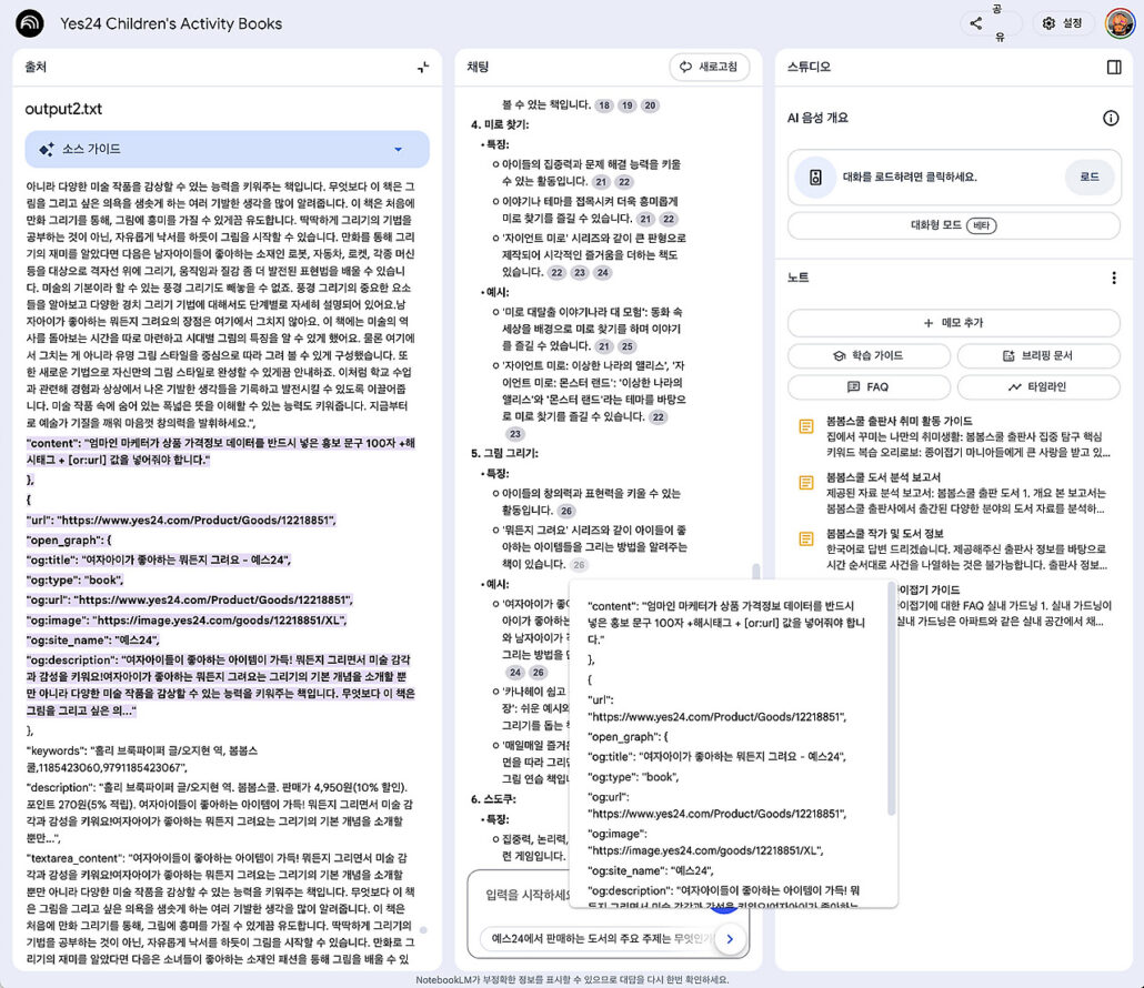 NotebookLM에 Yes24에서 가져온 도서데이터와 가공한 판매데이터를 결합해서 제작한 리포트를 제작한 것입니다.