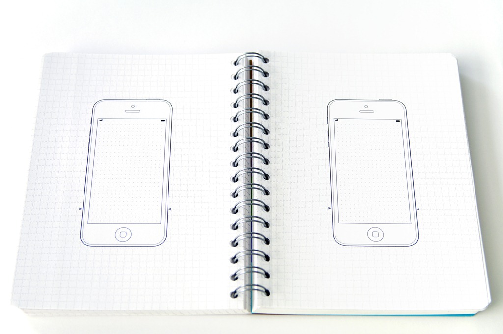 링제본 노트북을 표방하고 있으며 140mmX210mm 사이즈에 50mm 간격의 격자로 만들어졌습니다. 총 344페이지로 172페이지는 아이폰5 개발자 템플릿과 172페이지는 그리드로 되어 있습니다. 모두 검정색으로 인쇄되었으며 링제본이지만 스케닝을 하기쉽게 잘라서 사용할 수 있도록 미싱제본처리를 하였으며 개발 진행상황판에 붙여 함께 보면서 작업진행을 알아 볼 수 있도록 디자인 하였습니다.